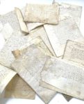 ARCHIVES XVIIe Ensemble de 25 documents datés de 1608 à 1695, sur parchemin et papier. Formats divers. Documents endommagés (déchirures, saleté, insolé, trous de vers). Principalement des quittances et des baux.