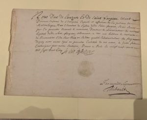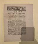 LAUZUN Antonin Nompar de Caumont, comte puis duc (1632-1723) Pièce signée, Paris, 29 mars 1705, 1 p. in-folio oblong. Sceau en cire rouge brisé, papier abimé. Document contresignée par son secrétaire. Nomination de Messire Jacques Nace, chanoine de l'église de St Fargeau, comme directeur et administrateur de l'hôpital de St Fargeau. On joint un « arrest de la cour du parlement » de Tours, pièce imprimée, signature imprimée d'Ysabeau. Tours, 4 août 1778. 4 pp. in-4. Imprimé à Paris, chez P. G. Simon, imprimeur du parlement 1778. Vignette en bandeau gravée sur bois, signée Papillon 1768. Condamnation de Françoise DUDEVANT, « à être pendue et étranglée jusqu'à ce que mort s'ensuive () pour avoir recélé un nombre considérable de vols domestique ». Provenance : Maison Charavay puis Monsieur A, Château de Vaux-Pénil par succession.