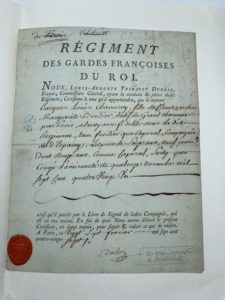 SOMBREUIL Charles François de Virot marquis de (1723-1794) Pièce signée (au dos), Paris le 27 février 1780. 1 p. ½ in-4. Marque de collection une croix de Saint Georges sur pied entourée des initiales « S » et « A ». Congé d'ancienneté en parti imprimé au bénéfice de Jacques Louis Chameroy. Document signé en bas de page par Louis-Auguste Thibault Dubois, au dos par le marquis de Sombreuil.
