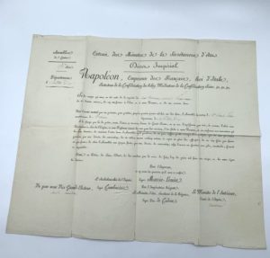 TALLEYRAND-PERIGORD Charles-Maurice de (1754-1838) Pièce signée « Charles-Maurice » Saint-Cloud, le 19 juin 1813. 1 p. in-folio oblong ( 54,5 x 46 cm). Quelques déchirures aux marges. Nomination du sieur Antoine Hernoux. Beau document.
