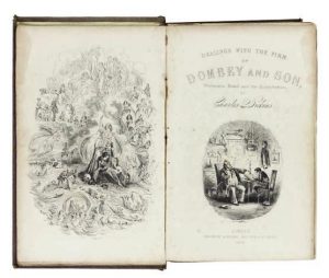 Dickens (Charles). Dombey and son. London, Bradbury and Evans, 1848. In-8, xvi-624-(2) pp., avec un papillon d’errata (12 lignes) relié entre la page 624 et le feuillet d’errata ; le dernier f. liminaire (table des planches) a été relié en fin