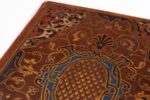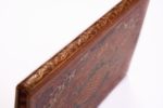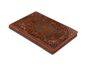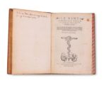 Vittoria COLONNA. Le Rime spirituali della illustrissima signora Vittoria Colonna Marchesana du Pescara. Venise, Vincenzo Valgrisi, 1548. Petit in-4, veau havane, les plats entièrement recouverts d'un décor à entrelacs aux filets dorés et fers azurés, certaines parties peintes ou recouvertes de cire de couleurs blanche, rouge, turquoise, noire et marron, dos lisse orné d'une tige foliacée, tranches peintes en bandes alternées rouges et noires ponctuées de même (Reliure pastiche postérieure). Brunet, II-161 / Hoefer, XI-299 /// 120. Belle édition qui contient des poèmes qui ne seront pas reproduits dans l'édition de 1558. Elle semble la plus complète, toutes les précédentes ayant toujours reçu des augmentations depuis la première publication à Parme en 1538. Bel exemplaire, réglé, de ce recueil de poésies dû à l'une des gloires de la poésie italienne, Vittoria Colonna (1490-1547), qui chanta notamment les louanges de son époux, Ferdinand-François d'Avalos, marquis de Pescaire, mort des suites des blessures qu'il reçut à la bataille de Pavie, ainsi que des poésies sacrées. Le décor de la très curieuse reliure qui recouvre ce volume a été exécuté plus tard, peut-être au XVIIIème siècle. Il est fait à l'imitation des reliures peintes italiennes du XVIème siècle. L'exemplaire provient de la bibliothèque de Paul Eudel dont il porte l'ex-libris au premier contreplat. Charnières un peu écaillées.