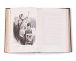 Louis REYBAUD. Jérome Paturot à la recherche de la meilleure des républiques. Paris, Michel Lévy frères, 1849. Grand in-8, percaline noire ornée d'un encadrement à froid et d'un grand motif doré sur chaque plat, titre doré sur le premier plat, dos lisse orné de même, tranches dorées (Cartonnage de l'éditeur). Vicaire, VI-1102 /// (2f.)-580-(1f. (sur 2)). Première édition illustrée contenant un frontispice et 29 planches hors-texte d'après Tony Johannot, et de nombreuses vignettes sur bois dans le texte. Exemplaire du premier tirage. Manque l'avis au relieur, quelques rousseurs éparses.