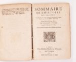 Nicolas VIGNIER. Sommaire de l'histoire des français. Recueilly des plus certains aucteurs de l'ancienneté, et digeré selon le vray ordre des temps Paris, Sébastien Nivelle, 1579. In-folio, vélin (Reliure de l'époque). Brunet, V-1218 / Hoefer, XLVI-144 /// (12f.)-421-(7f.). Edition originale de cet ouvrage qui finit à la mort de Louis XII. Il est, selon Hoefer, exact, curieux et plein de recherches. Bel exemplaire dans son vélin de l'époque. Minimes piqûres à quelques feuillets et galerie marginale aux derniers feuillets.