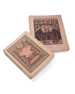 Anatole FRANCE. La Rôtisserie de la Reine Pédauque. Paris, Mornay, 1920. In-8, broché. Feuille, 35 / 44 /// (2f.)-313-(3f.) / (4f.)-137-(1f.). Frontispice et illustrations gravées sur bois dans le texte de Louis Jou. Tirage à 1095 exemplaires, celui-ci un des 30 Japon hors commerce (n° XXII). On joint : Anatole FRANCE. Abeille. Paris, André Coq, 1923. Grand in-8, broché. Illustrations dans le texte gravées sur bois de Louis Jou. 1/375 sur Hollande (n° 140). Provenance : Collection Albert Sarraut
