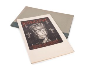 Léo LARGUIER. Jeanne d'Arc. Les Baux-de-Provence, Les Livres de Louis Jou, 1944. In-folio, en feuilles, portefeuille à rabats. Feuille, 88 /// (40f.). Un bois pour la couverture, 17 grands bois à pleine page et ornements de Louis Jou. Tirage à 120 exemplaires, celui-ci un des 20 sur Japon impérial (n° 40). Provenance : Collection Albert Sarraut