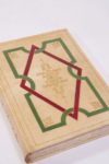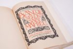 SAINT MATTHIEU. Évangile. Traduction par Le Maistre de Sacy. Paris, Louis Jou, 1928. In-8, bradel vélin à recouvrements, décor sur le premier plat composé d'un large listel peint en vert formant encadrement rectangulaire avec parties lobées dans les milieux et d'un large listel peint en bordeaux de forme losangée, filets et fleurons dorés venant rehausser la composition, rappel du décor sur le second plat, titre en long en lettres rouges au dos, tête dorée, couverture et dos, chemise et étui (Lavaux). Feuille, 58 /// (3f.)-191-(2f.). Très belle typographie en noir et rouge, imprimée avec les caractères dessinés par Louis Jou. Nombreuses ornementations et 81 bois gravés par Louis Jou, dont 29 à pleine page, 28 lettrines, 22 culs-de-lampe, une planche de justification et la marque de l'imprimeur. Tirage à 310 exemplaires, celui-ci un des 245 sur vergé (n° 111). Bel exemplaire. Chemise et étui un peu abîmés.