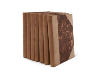 ARTS DÉCORATIFS INDUSTRIELS MODERNES. Paris, Imprimerie nationale, s.d. (vers 1925). 7 volumes in-4, bradel demi-papier crème à coins, dos imprimés en lettres dorées (Reliure de l'éditeur). I. 7 à 118-(2f.)-96 pl. / II. 7 à 102-(2f.)-96 pl. / III. 7 à 101-(2f.)-96 pl. / IV. 7 à 102-(1f.)-96 pl. / V. 9 à 106-(2f.)-96 pl. / VI. 7 à 104-(1f.)-96 pl. / VII. 7 à 114-96 pl. Superbe publication sur l'exposition internationale des Arts décoratifs et industriels modernes qui se déroula à Paris en 1925. Chaque volume contient 96 planches hors texte, soit 672 planches reproduisant les arts décoratifs de l'époque depuis les plus petits objets de table jusqu'aux moyens de locomotion, automobiles, bateaux, avions, en passant par les meubles, la mode, les bijoux Un volume entier est consacré à l'art du livre. Bel exemplaire malgré les dos brunis, de menus défauts aux reliures et un accroc à une coiffe.