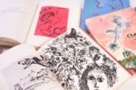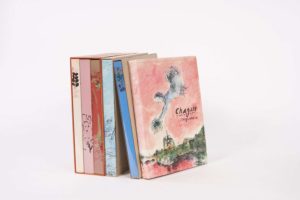 [CHAGALL]. Julien CAIN, Fernand MOURLOT et Charles SORLIER. Chagall lithographe. Monte-Carlo, André Sauret, 1960-1986. 6 volumes in-4, cartonnage toilé, jaquettes (Reliure de l'éditeur). I. 220-(1f.), 12 lith. / II. 209, 11 lith. / III. 179-(1f.), 2 lith. / IV. 180-(1f.), 2 lith. / V. 250-(1f.). / VI. 223-(1f.). 27 lithographies originales (dont couvertures, frontispices et hors-texte) et très nombreuses reproductions dans le texte, en noir ou en couleurs, de Marc Chagall.