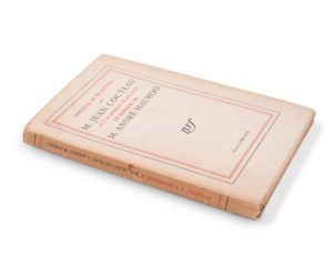 Jean COCTEAU. Discours de réception à l'Académie française et réponse de M. André Maurois. Paris, NRF, 1955. In-12, broché. 117-(5f.). Édition originale sur papier d'édition. Envoi autographe signé sur le faux titre : à Michelen / Lange / ce / souvenir / de / Jean Cocteau / * Couverture salie, détachée du volume.