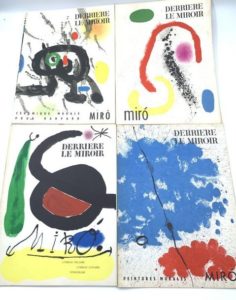DERRIERE LE MIROIR. MIRO. Paris, Maeght, Pierre à feu, 1961-1967. 5 volumes in-folio, en feuilles. Ensemble contenant les numéros 123, 125-126, 128, 151-152 et 164-165 tous consacrés à Miro avec parfois des lithographies. Les numéros apparaissent complets, mais ceux-ci étant en feuilles, nous ne pouvons garantir que tous les feuillets ou planches soient présents, certains d'entre eux ne portant pas de pagination.