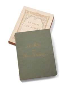 Edmond DULAC. Hans Christian ANDERSEN... La Reine des Neiges et quelques autres contes. Paris, Piazza, 1911. - Charles PERRAULT, Jeanne-Marie LEPRINCE de BEAUMONT. La Belle au bois dormant et quelques autres contes de jadis. Ibid., id., 1910. 2 volumes in-4, brochés. Monod, I-245 / II-8994 /// 198-(2f.) / 172 (mal chiffrés dans les feuillets liminaires)-(2f.). Premier ouvrage contenant La Reine des Neiges, La Petite Sirène, Le Rossignol, Une vraie princesse, Conte du vent, Les Habits neufs de l'Empereur et Le Jardin du Paradis. Second ouvrage contenant La Belle au bois dormant, La Barbe bleue, Cendrillon de Charles Perrault et La Belle et la bête de Jeanne-Marie Leprince de Beaumont avec une préface d'Edmond Pilon. Respectivement 28 et 30 illustrations hors texte en couleurs, contrecollées, d'Edmond Dulac.