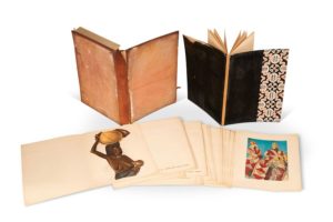Alexandre IACOVLEFF. Dessins et peintures d'Afrique, Exécutés au cours de l'Expédition Citroën Centre Afrique, Deuxième mission G.-M. Haardt, L. Audouin-Dubreuil. Paris, Vogel, Meynial, 1927. In-folio, texte explicatif relié en demi-daim avec plats de soie noire peinte et une suite en feuilles, chemise de l'éditeur. Nombreux dessins autour et en surimpression du texte et 36 (sur 49) planches en couleurs de Alexandre Iacovleff. L'exemplaire a été imprimé pour Albert Sarraut. Exemplaire incomplet, emboîtage de l'éditeur et couverture en daim très abîmés.