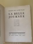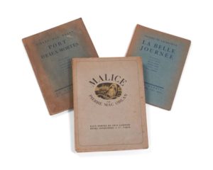 MAC ORLAN (Pierre), Port d'eaux-mortes, lithographies originales de Georges Grosz, Paris, Au sans Pareil, 1926 LACRETELLE (Jacques de), La belle journée, eaux-fortes de Chas Laborde, Paris, Au sans Pareil, 1925 Pierre MAC ORLAN. Malice. Paris, Jonquières, 1924. In-8, broché. Monod, II-7556-7571 /// (1f.)-145-(1f.) / (3f.)-80-(1f.). Un bois pour la couverture et 31 pointes-sèches en couleurs de Chas Laborde dont le frontispice, 10 têtes-de-chapitre, 10 planches hors texte et 10 culs-de-lampe. Tirage à 746 exemplaires, celui-ci un des 650 sur Rives. Couverture abîmée et rares piqûres. On joint : Jacques de LACRETELLE. La Belle journée. Paris, Au Sans Pareil, 1925. In-8, broché. Édition originale illustrée de 6 eaux-fortes hors texte de Chas Laborde. (1/1000 exemplaires sur vélin, n° 772). Couverture abîmée. - Pierre MAC ORLAN. Port d'eaux-mortes. Paris, Au Sans-Pareil, 1926. In-8, broché. Édition originale ornée de 8 lithographies originales hors texte de Georges Grosz (1/1.000 vélin, n°964). Couverture abîmée.