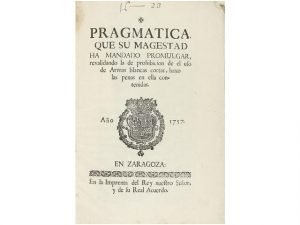 1757. (ARMAS). PRAGMATICA QUE SU MAGEDTAD HA MANDADO PROMULGAR REVALIDANDO LA DE PROHIBICION DE EL USO DE ARMAS BLANCAS CORTAS, BAXO LAS PENAS EN ELLA CONTENIDAS. Zaragoza: Imp. del Rey nuestro Senor, 1757. Folio. Portada y 4 h. Enc. moderna en...