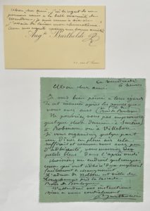 BARTHOLDI (Auguste) — Une lettre autographe signée (Paris, 2 juillet 1897) et une carte de visite autographe signée de son paraphe (s.l.n.d.).