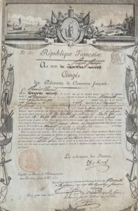 Congé délivré au capitaine Joseph-François-Marie Lemaistre, pour quitter le port de Marseille et aller à Grandville avec son bâtiment « L'Épervier enregistré et domicilié au port de Marseille, construit à Grandville en 1787 [...] », brick de 12 mètres ayant 2 mats, d'une capacité de 111 tonneaux. Avec une apostille d'un employé du bureau de navigation à la douane du port du Havre (3 floréal an XI–23 avril 1803).