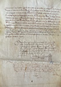 SAINT-CHAMOND. – Demoras (Benoît) — Pièce signée en qualité de notaire public sous l'autorité du bailly de Forez, Jacques d'Urfé, et du juge-général de la baronnie de Saint-Chamond.