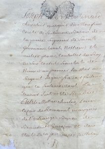 Fin de décembre 1775 ou début de 1776. 24 pp. dans un cahier in-folio de parchemin ; document incomplet de la fin. Acte du marquis de Montfrin, Joseph de Monteynard en qualité de sénéchal de Nîmes, concernant une reconnaissance de fief que le marquis de Lestrange, Louis-César de Romanet, capitaine de cavalerie au régiment de la reine exige pour sa seigneurie de La Bâtie, sur l'actuelle commune de Préaux, non loin de son château de La Faurie sur l'actuelle commune de Saint-Alban-d'Ay dans le département de l'Ardèche.