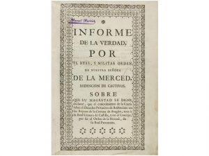 (LEGALIZACION ORDEN MERCED). INFORME DE LA VERDAD POR EL REAL,Y MILITAR ORDEN DE NUESTRA SENORA DE LA MERCED, REDENCION DE CAUTIVOS. [Madrid: Editado por la Orden. Jose Nicolas Cavero ? ]. 4° mayor. 4 h. + 374 p. + 15 p. Vinetas y capitales. Enc....