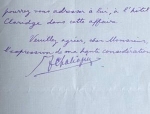 Paris, 2 juin 1924. Une p. 1/2 in-8, en-tête imprimé à son nom. « ... Je regrette infiniment que je suis obligé de vous dire que je suis lié par un contrat pendant mon séjour ici, qui m'interdit de chanter sans le consentement de mon imprésario. Celui-ci, monsieur Hurock [Solomon Gurkov dit Sol Hurok], est à Paris en ce moment, et en tout cas, vous pourrez vous adresser à lui, à l'hôtel Claridge dans cette affaire... »