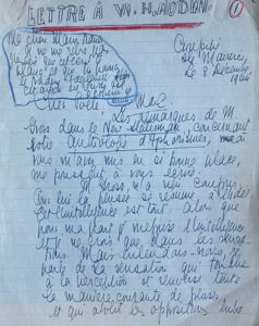 Apostille autographe en marge de la première page, destinée à une traductrice : « Ma chère Marie-Paul, je ne me relis pas. J'espère que ce écrit te plaira et que tu pourras le traduire facilement. Cet article est réussi s'il... »