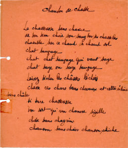 DESNOS (Robert) — Poème autographe intitulé « Chanson de chasse ».