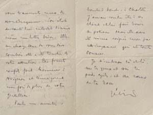 S.l., automne 1914 : « Ma Noura, j’ai tant de douces raisons de penser à toi – que ce n’est certes pas par oubli que je ne t’ai pas écrit. Quoique je sois sans excuse, tu me pardonneras, avec ta bonne grâce coutumière. Les heures trop brèves que j’ai passées avec toi, cette nuit où les zeppelins ne sont pas parvenus à éteindre ton beau sourire, me restent précieuses. Elles ont d’ailleurs coïncidé avec le rétablissement d’une santé qui s’était un peu délabrée durant mon séjour à Londres. Quant à toi, sur qui nulle fatigue n’a prise, tu avais comme toujours ton teint magique. Sur les roses de tes joues et de ton coquillage, sur les blancheurs de ton corps et sur ses blondeurs en touffe, je mets des baisers et des baisers... »
