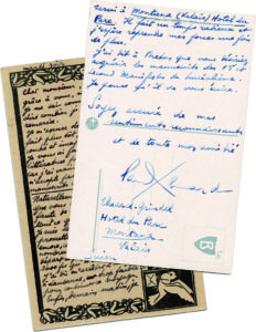 J'ai dit à Breton que vous désirez aquérir les manuscrits des 1er et second Manifestes du Surréalisme. Je pense qu'il va vous écrire. Soyez assuré de mes sentiments reconnaissants et de toute mon amitié. Paul Éluard.