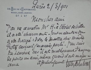 Paris, 2 mars 1901. 1 p. in-16 oblong, en-tête imprimé à son adresse. « J'ai vu ce matin Mr H. à l'Hôtel de ville. Il a été charmant. Tout malentendu a été dissipé : dites-le à notre cher Maître Rotes auquel j'en avais parlé. J'en suis très heureux car il est malheureux toujours de perdre un ami, même quand il est en espérance... »