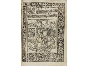 TRACTATUS CONTRA IUDEOS ... IN CANTICA AUTEM CANTICORUMEIUSDEM AUREAS EXPOSITIONES ... EMENDATUM [ET] CORRECTUM ... [En colofón: Venund atur Lugduni : a Stephano Gueynard al's pineti prope sanctum Antonium, 1518]. 4°. 8 h. LXIII folios. Portada con grabado y orla figurada. 1 er. folio numerado con orla figurada. Texto a dos columnas. Enc. de època en pergamino. Jaime Pèrez de Valencia (Ayora 1408-Valencia 1490) fuè obispo de Valencia durante la ausencia de Rodrigo de Borja. Entró en la orden de los agustinos. Pronto empezó a estudiar filosofía y teología. Es uno de los mas destacados expositores de las Sagradas Escrituras en el S. XV. Esta obra que ofrecemos, su comentario de los salmos, fuè impreso por primera vez en Valencia en 1484. Sus obras fueron reeditadas muchas veces. CCPB 20462-5.