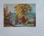 Los Angeles, 2 janvier 1953. Une p. in-12 carré, sur un bifeuillet de papier fort avec au recto du second feuillet la reproduction d'un tableau représentant un paysage de forêt en automne ; enveloppe conservée.