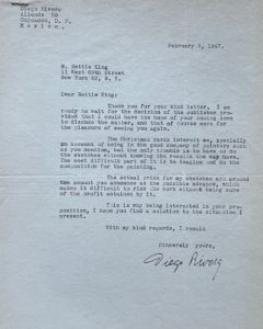 Mexico, 3 février 1947. 1 p. dactylographiée in-folio. Le peintre évoque ses hésitations quant à la proposition qui lui est soumise de participer à un projet de cartes postales illustrées.