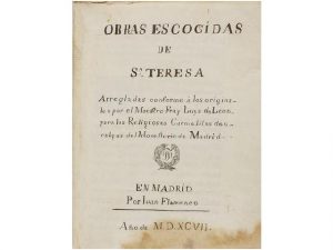 que se intitula Castillo espiritual o las Moradas. Con unas esclamaciones o meditaciones espirituales. Madrid, En la Imprenta Real [al fin:] por Juan Flamenco, 1597. 19,5x15 cm. 396 paginas. 4 hojas, 192 paginas. 218 paginas. Piel del siglo XIX. Tres portadas, una para cada parte. (Falta la primera y 3 hojas de preliminares). Primera edición rarísima de las obras de Santa Teresa publicada en Madrid. Ademas de la 'Vida', contiene con portada propia: 'Libro llamado Camino de Perfección', Madrid, Juan Flamenco, 1597. Sigue con portada propia y escudo de la orden carmelitana: 'Libro llamado Castillo interior, o las Moradas', Madrid, en la Imprenta Real [al final:] por Juan Flamenco, 1597. Sigue a continuación y con la misma paginación: 'Esclamaciones, o Meditaciones del alma a su Dios... '.