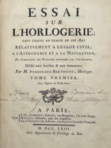 UN DES MAÎTRES DE L'HORLOGERIE FRANÇAISE, FERDINAND BERTHOUD (1727-1807) était originaire de Suisse et se fixa à Paris en 1745. Doué, lié aux milieux encyclopédistes et protégé des Choiseul, il rencontra rapidement le succès. Dans les années 1760, il fut adjoint aux commissaires de l'Académie des Sciences en mission en Angleterre pour apprécier l'horloge de marine inventée par John Harrison, dite horloge à longitudes, et sut utiliser les informations recueillies pour produire à son retour en France son propre modèle, modifié, dont il obtint la fourniture exclusive à la Marine française à partir de 1768. Dans sa manufacture à Argenteuil, il produisit également des chronomètres portatifs. Il publia plusieurs ouvrages techniques et d'histoire de l'horlogerie, dont le présent traité qui assit définitivement sa réputation. Il fut agrégé à la classe des sciences de l'Institut.