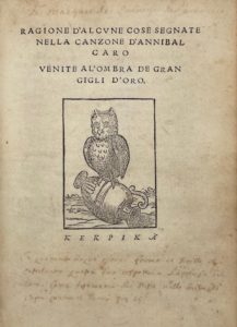 PAMPHLET DE POLÉMIQUE LITTÉRAIRE SUR FOND D'ACCUSATION D'HÉRÉSIE. Le poète et traducteur Annibal Caro (1507-1566) avait en 1553 publié une canzone en vers, Venite all'ombra dei gran gigli d'oro (« Venez à l'ombre des grands lys d'or »), dithyrambe en l'honneur de la Couronne de France écrit à la demande du cardinal Alessandro Farnese, et que Joachim Du Bellay avait traduite en français. Lodovico Castelvetro émit des critiques, engageant une longue dispute qui, quoique fondée sur une vraie dissension au plan des principes linguistiques et littéraires, prit une tournure tragique : Annibal Caro, blessé dans son orgueil de poète de Cour, publia pour se défendre une Apologia degli Academici di Banchi di Roma (1558), dans laquelle, descendant jusqu'au ton bouffon de la pasquinade, il accusait ouvertement Lodovico Castelvetro d'hérésie. Quarante-cinq jours plus tard, ce dernier répliqua avec la présente Ragione, où il y synthétise ses arguments, critique le choix d'un vocabulaire élargi à des termes vils ou étrangers, vilipende l'usage de métaphores hasardeuses ou l'incohérence et la boursouflure du style.