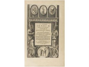 1652. (HUMANIDADES). SENECA: L. ANNAEI SENECAE PHILOSOPHI OPERA QUAE EXSTANT OMNIA: A IUSTO LIPSIO EMENDATA ET SCHOLIIS ILLUSTRATA. Antuerpiae: ex Officina Plantiniana Balthasaris Moreti, 1652. Folio. 8 h. + XXXVI + 911 p. Portada grabada y con orla...