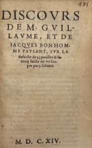 SONGE de Maistre Guillaume, avec un recit general de tout ce qui s'est passé dans Montauban. S.l.n.n., 1622. 14 pp. Sur la campagne de l'armée royale dans le Sud de la France contre les troupes protestantes du duc de Rohan. – LE REVEIL de maistre Guillaume, aux bruits de ce temps. S.l.n.n., 1614. 32 pp. Il dit préférer « la paix et la cuisine aux tumultes de la guerre ». – DISCOURS de M. Guillaume, et de Jacques Bonhomme paysant, sur la defaicte de 35. poulles & le cocq faicte en un souper par 3. soldats. S.l.n.n., 1614. (2)-6 pp. Sur les bienfaits de la paix pour les paysans, à l'occasion du traité de Sainte-Ménehould conclu entre la Régente et les Princes. – LA LETTRE de maistre Guillaume. Envoyee a messieurs les Parisiens. À Paris, chez Estienne Perrin, 1617. 12 pp. – RENCONTRE de Me. Guillaume et un messager de fortune, parlant des affaires de ce temps. S.l.n.n., 1620. 16 pp. Protestation contre ceux qui poussent à la guerre pour des raisons d'intérêt personnel. – LE RETOUR du dernier voyage de Me Guillaume de l'autre monde. S.l.n.n., 1623. 15-(une blanche) pp. Pour vouer les voleurs aux enfers. – SUITTE DES RENCONTRES de M. Guillaume en l'autre monde. A Paris, chez Pierre Ramier. 1609. 46-(2) pp. – L'ESTONNEMENT de Mre. Guillaume sur le changement de la Cour. S.l.n.n., 1624. 12 pp.
