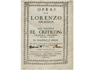 1748. (LITERATURA ESPANOLA). GRACIAN, BALTASAR: OBRAS DE LORENZO GRACIAN. TOMO PRIMERO QUE CONTIENE EL CRITICON PRIMERA, SEGUNDA Y TERCERA PARTE. EL ORACULO Y HEROE. Barcelona: por Pedro Escuder y Pablo Nadal, 1748. 8° mayor. 4 h. + 519 p., 5 h....
