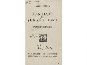 1924. (VANGUARDIAS-1a EDICION). BRETON, ANDRE: MANIFESTE DU SURREALISME. Poisson soluble. Paris: Éditions du Sagittaire, 1924. 8°. 190 p., 3 h. Encuadernación posterior en tela sin conservar las cubiertas originales. Dos pequenas inscripciones de...