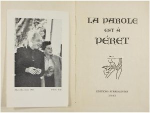 1943. (VANGUARDIAS-1a EDICION). PERET, BENJMIN: LA PAROLE EST À PÉRET. New York: Editions surrealistes, 1943. 8° menor. 48 p. Una fotografía de Pèret y de Remedios Varos realizada por Ylla (Marsella, 1941) en el frontis. Rústica editorial algo...