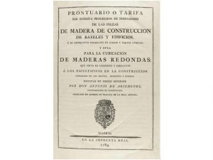 PARA LA CUBICACIÓN DE MADERAS REDONDAS QUE SIRVA DE GOBIERNO Y DIRECCIÓN A LOS FACULTATATIVOS EN LA CONSTRUCCIÓN EMPLEADOS EN LOS MONTES, DEPÓSITOS Y RIBEROS. Madrid: en la Imprenta Real, 1789. Folio. 3 hojas (inclusive portada con escudo real grabado), 491 paginas. Papel de calidad superior y muy grueso. En las paginas 423 y 425, grabados del corte y medición de las maderas. Magnífica impresión digna de la Imprenta Real. Encuadernación original en pergamino con solapa y cierre. Perfecto ejemplar. Edición original muy rara, ya que se imprimieron pocos ejemplares. Conjunto de tablas para la medición y cubicage de las maderas para la construcción de barcos. '...esta practica se hace muy precisa, principalmente quando hay urgente precisión de adelantar las labras, a fin de no atrasar al Asentista, o bien por administración, en esta operación y su pago, como ni tampoco el de los acarreos por tierra y rio, que se executan prontamente por codos cúbicos, pues infinitas veces ocurre que ya las nieves y lluvias, y la situación de las piezas en parage de muy dificil aproximación, ofrecen insuperables inconvenientes para usar del tintero [...] en conclusión es de advertir, que despues de enterado el Facultativo que mide las piezas de los codos cúbicos que producen sus dimensiones, conviene que los grabe en cada una de ellas, según corresponda, con la herramienta que llaman el 'marcador', y esta en uso en el Principado de Asturias [...]. Antonio de Arizmendi, tenia el cargo de contramaestre de construcción, y era Alférez de fragata de la Real Armada. De los pcoos ejemplares impresos, una parte importante se enviaron a América, para su uso en la tala de madera para la construcción de barcos. Palau 16780.