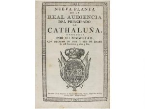 4° mayor. 15 p. Palau 196267. [Mas:] ORDENANZAS DE LA REAL AUDIENCIA DE EL PRINCIPADO DE CATHALUNA MANDADAS IMPRIMIR POR SU MAGESTAD. Barcelona: por Joseph Texidó, 1742. 4° mayor. 144 p., 2 h. Palau 202661. Por el decreto de Nueva Planta, publicado el 16 de enero de 1716, Felipe V configuro un régimen político que excluía la representación de la sociedad catalana y reforzaba la preeminencia de las autoridades militares sobre las civiles y una asignación casi sistematica del gobierno de los corregimientos (demarcaciones substitutas de las veguerías) a oficiales del ejército del rey.