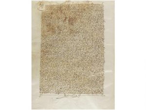 1477 ca. (REYES CATOLICOS). DOCUMENTO DEL NOTARIO JUAN PEREZ, EL MISMO QUE REALIZO EL TESTAMENTO DE LOS REYES CATOLICOS. VERSA SOBRE PAGOS MILITARES EN LA 'GUERRA CONTRA LOS MOROS'. 19 p. manuscritas sobre pergamino en 4° mayor. Cubiertas de...