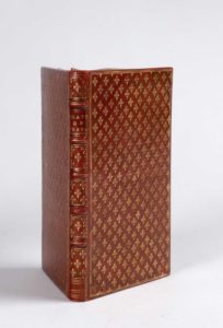[FÉLIBIEN (André)]. La description du château de Versailles. A Paris, chez Antoine Vilette, 1694. In-12, [1] f., 93 p., pl., plein veau cerise du XXe s., dos à 5 nerfs, titre doré, caissons et plats ornés d’un semé de fleurs de lys et bordés d’un double filet, le tout doré, filet doré aux coupes, tranches dorées (mouillures pâles en début de vol. puis sporadiques, qq. taches claires et bruniss., piq. de ver en marge des 5 premiers f., petite déch. sans manque à une pl., petit manque latéral sur une autre pl. rognée court). Charmant exemplaire de cet ouvrage peu courant. C’est une nouvelle édition du texte paru en 1674 sous le titre Description sommaire du Chasteau de Versailles. L’édition de 1674 n’était illustrée que d’un plan. En revanche, l’illustration de celle-ci, entièrement gravée sur cuivre, se compose d’une vignette au titre, par Schoonebeck, et 27 figures gravées sur 16 planches dont 4 dépliantes. Signature ancienne au titre.