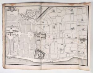 LE CARPENTIER (Matthieu). Recueil des plans, coupes et élévations du nouvel hôtel de ville de Rouen dont la construction a été commencée en mai 1757, avec les plans d'un accroissement et autres ouvrages projettés pour cette ville... A Paris, chez C.-A. Jombert, 1758. In-folio, [1] f. (faux-titre), 9 p., 6 pl., broché, couv. muette ancienne (lacunes à la couv. ; taches aux f. de texte et en marge des 2 première pl.). Edition originale de ce projet, dédiée au duc de Montmorency-Luxembourg, dont les armes figurent dans un bandeau gravé par Prévost d’après Hallé. Les planches offrent un plan du centre de la ville de Rouen, 2 plans, 2 élévations et une coupe de l’édifice projeté.