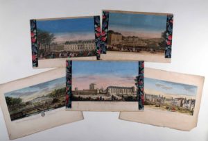 [Gravure]. [Châteaux]. Ensemble de 5 vues d’optique dessinées, gravées sur cuivre et …