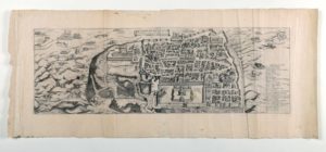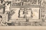 [Gravure]. [Topographie]. [Jérusalem]. Description de la ville de Ierusalem avec les noms des saints lieux ou antiquitez qui sont visitez par les pellerins et voiageurs. A Paris, chez Iean Boisseau, 1643. Une vue gravée sur cuivre, env. 24,5 x 73 cm. (cuivre) ; marges et onglet inclus 37 x 87,5 cm. (plis sans gravité ; petite tache claire dans l’enceinte du Temple, qq. salissures au dos). Très rare vue panoramique gravée de Jérusalem. Elle fait partie du rarissime atlas publié à Paris par Jean Boisseau entre 1642 et 1648, le « Theatre des citez ». De nombreux lieux aux alentours de la ville portent leur désignation gravée ; une légende placée à droite de la gravure identifie 28 points de la ville. Titre manuscrit ancien au dos ; onglet dans la marge de gauche et trace d’onglet central au dos. (Pastoureau, Les atlas français, Boisseau I, n° 55).