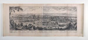 [Gravure]. [Topographie]. [Paris]. Paris. Boisseau ex[cudit], [entre 1642 et 1648]. Une vue gravée sur cuivre, 27 x 69 cm. (cuivre) ; marges incluses 33,5 x 82 cm. (habiles restaurations en bas à gauche et en haut à droite, discret renfort des marges au v° ; plis légers, qq. rares rouss.). Très rare vue panoramique gravée de Paris. Elle fait partie du rarissime atlas publié à Paris par Jean Boisseau entre 1642 et 1648, le « Theatre des citez ». Mention de privilège. Légende en marge sous la gravure, identifiant 56 lieux ou édifices. Trace d’onglet au verso. (Pastoureau, Les atlas français, Boisseau I, n° 1).