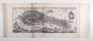 [Gravure]. [Topographie]. [Venise]. Description de l’opulente et manifique ville de Venise. A Paris, chez L. Boissevin, [vers 1650]. Une vue gravée sur cuivre, env. 27,5 x 69,5 cm. (cuivre) ; marges et onglet inclus 38 x 93,5 cm. (bruniss. et lég. mouillures le long d’un pli). Très rare vue panoramique gravée de Venise. Elle fait partie du rarissime atlas publié à Paris par Jean Boisseau entre 1642 et 1648, le « Theatre des citez ». Cet exemplaire porte l’adresse du marchand Louis Boissevin, visiblement regravée sur le cuivre d’origine. Lorsque Boisseau cessa son activité, vers 1648, Louis Boissevin récupéra une partie de son fonds qu’il continua d’exploiter. De nombreux lieux et édifices de la ville ainsi que des îles de la lagune portent leur désignation gravée. Titre manuscrit ancien au dos ; onglet dans la marge de gauche et trace d’onglet central au dos. (Pastoureau, Les atlas français, Boisseau I, n° 35, à l’adresse de Boisseau).